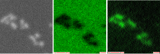 Augerove mapy Au nanočastíc na Si platničke. Výsledok sa približuje limitným možnostiam prístroja (a) SEM (b) Si AUGER (c) Au AUGER.